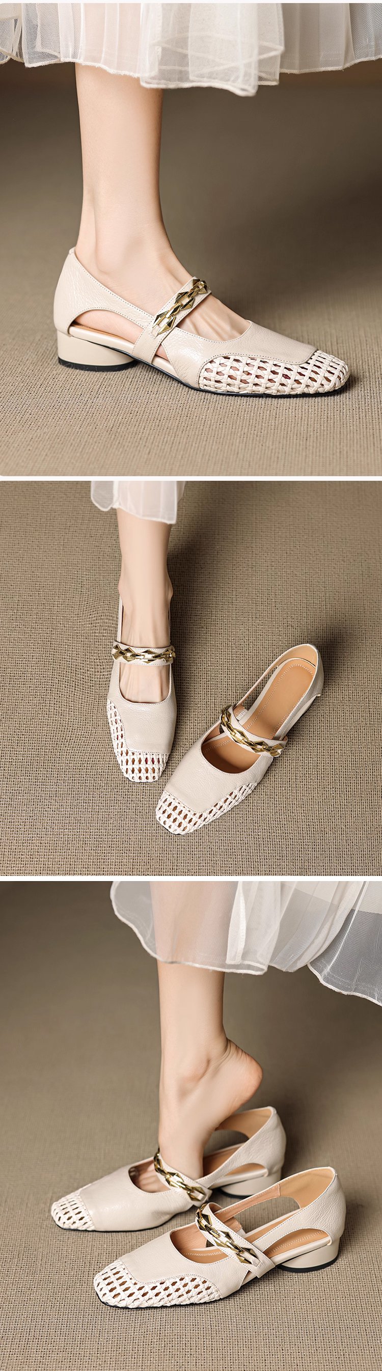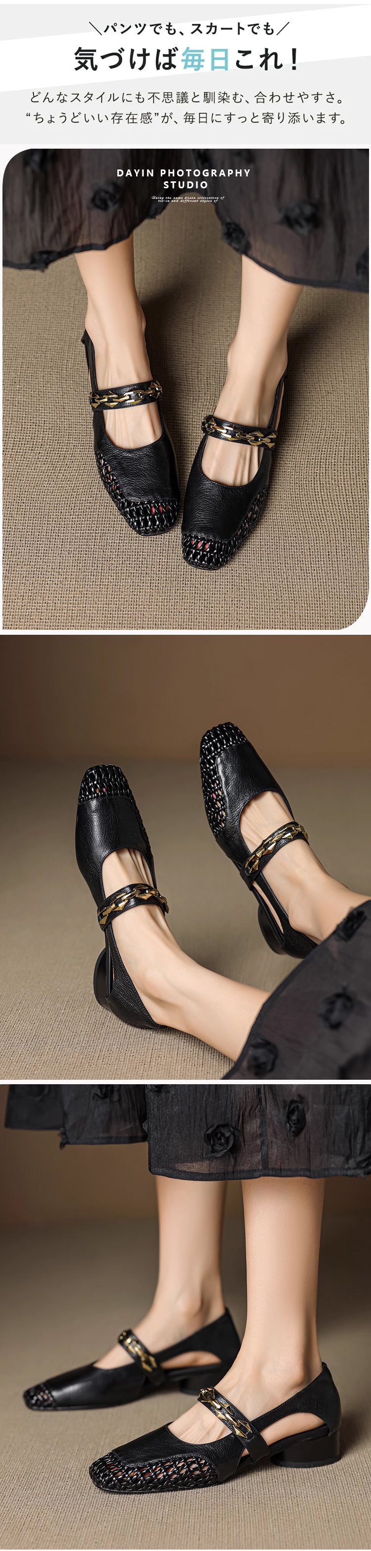 【疲れない3cmローヒール】フランス風の透かし編みレザーサンダル
